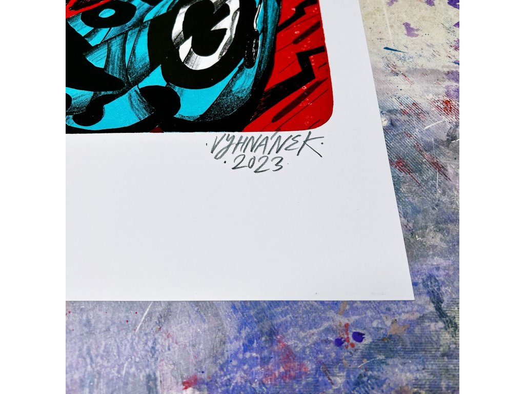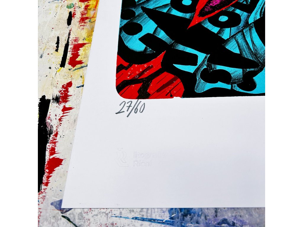 Vlevo dole naleznete číslo tisku lomeno celkový náklad 60 ks a také slepotiskové razítko dílny v Říční. Vpravo poté je rok a autorský podpis.
