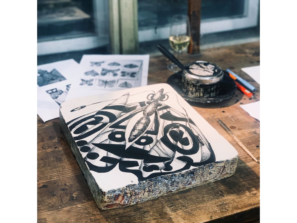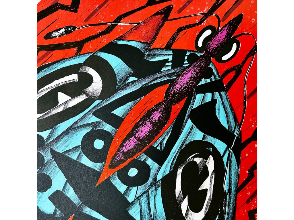 Popis: Limitovaný litografický tisk Flight in the rain, který vznikal v litografické dílně Říční.