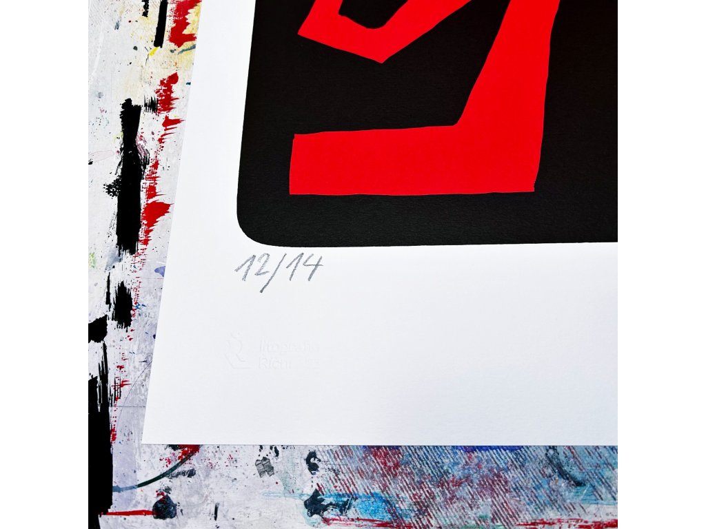 Vlevo dole naleznete číslo tisku lomeno celkový náklad 14 ks a také slepotiskové razítko dílny v Říční. Vpravo poté je rok a autorský podpis.